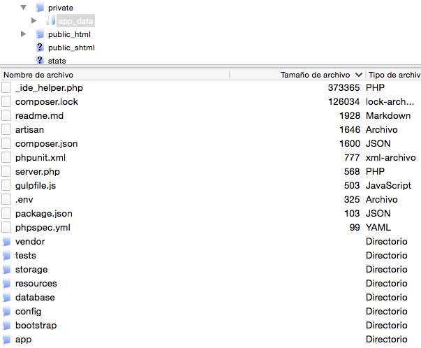 El siguiente paso, es crear dentro de la carpeta private otra carpeta donde guardaremos el resto de carpetas y ficheros de laravel.